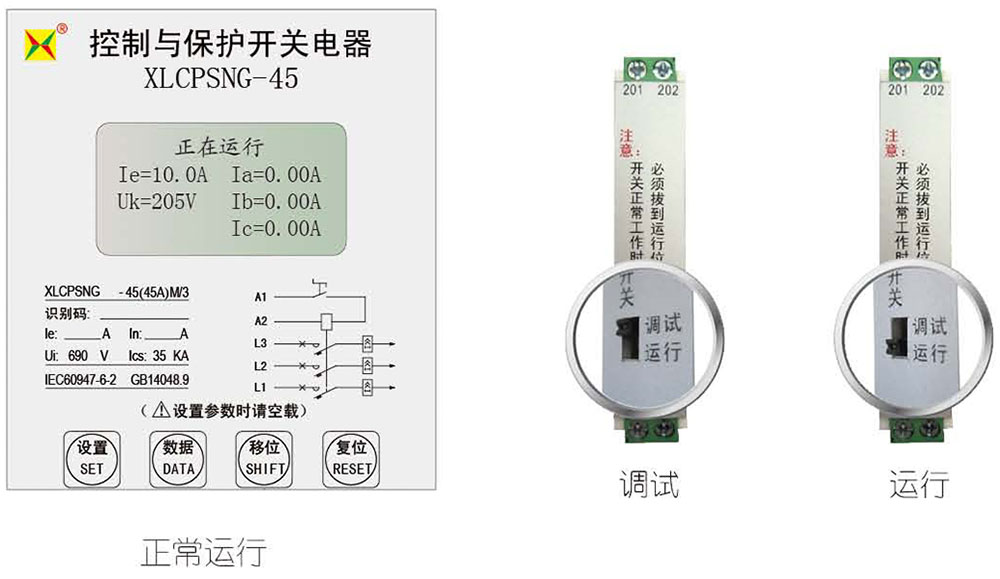 撥碼開(kāi)關(guān)處于“調(diào)試”位置時(shí),具有調(diào)試保護(hù)功能;撥碼開(kāi)關(guān)處于”運(yùn)行” 位置時(shí),為帶消防功能控制與保護(hù)開(kāi)關(guān)(使用方法詳見(jiàn)消防功能模塊說(shuō)明)。